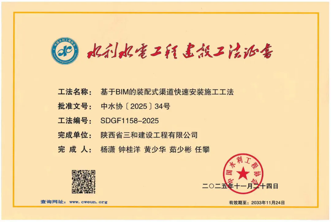 Recently, the "2025 Water Conservancy Industry Construction Methods Review Results" announced by the China Water Conservancy Engineering Association was officially released. The "BIM-based Rapid Installation Construction Method for Prefabricated Channels," independently developed and applied for by Shaanxi Sanhe Construction Group Co., Ltd., was awarded the 2025 Water Conservancy Industry Construction Method.