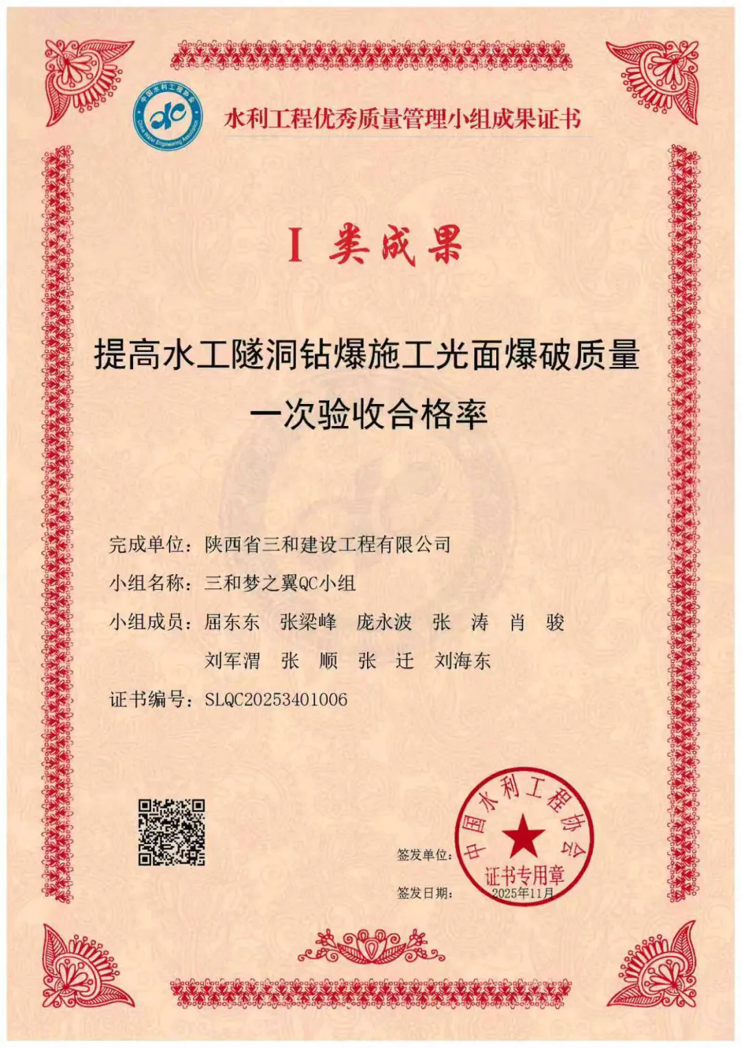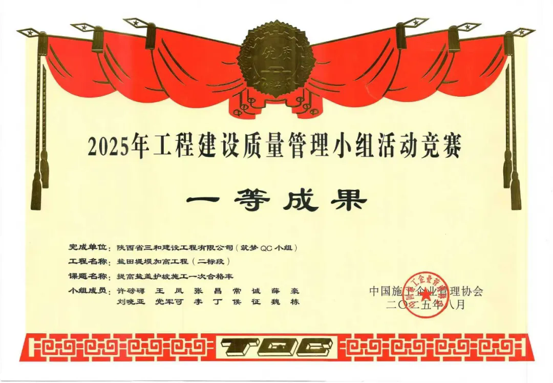 In 2025, the company obtained 1 water conservancy industry construction method and 2 water conservancy enterprise construction methods; 1 first-class achievement, 2 second-class achievements, and 1 third-class achievement for Excellent Quality Management Groups from the China Association of Construction Enterprise Management; 1 Class I achievement for Excellent Quality Management Groups from the China Water Conservancy Engineering Association; 2 Class I achievements for Excellent Quality Management Groups from the Shaanxi Construction Industry Association; and applied for 3 national utility model patents.