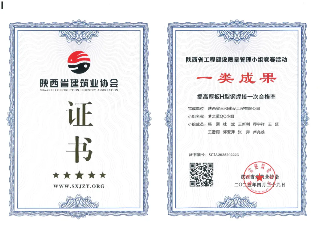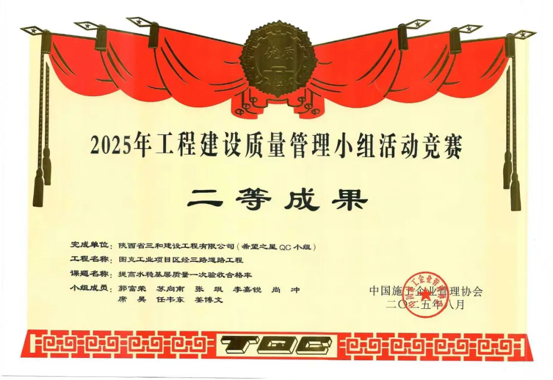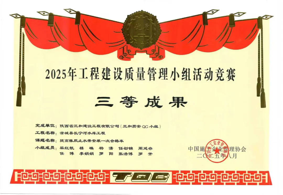 En 2025, la société a obtenu 1 méthode de construction au niveau de l'industrie de l'hydraulique et 2 méthodes de construction au niveau de l'entreprise hydraulique ; 1 premier prix, 2 deuxièmes prix et 1 troisième prix pour les résultats des groupes d'excellence en gestion de la qualité de l'Association chinoise de gestion des entreprises de construction ; 1 résultat de classe I du groupe d'excellence en gestion de la qualité de l'Association chinoise de l'ingénierie hydraulique ; 2 résultats de classe I du groupe d'excellence en gestion de la qualité de l'Association de l'industrie de la construction du Shaanxi ; et a déposé 3 brevets nationaux d'invention de modèle d'utilité.